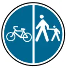 Пешеходная дорожка с полосой для велосипедистов. Этот знак можно увидеть в том случае, если на тротуаре (дорожке) есть выделенные отдельные полосы для пешеходов и велосипедистов (к примеру, справа идут пешеходы, слева едут на велосипедах).