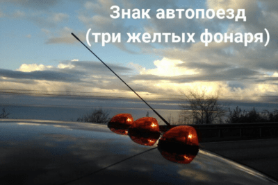 *Знак «Автопоезд» — в виде трех фонарей оранжевого цвета, расположенных горизонтально на крыше кабины с промежутками между ними от 150 до 300 мм — на грузовых автомобилях и колесных тракторах с прицепами, а также на сочлененных автобусах и троллейбусах.