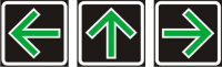 5.72.3 «Рекомендуемое направление движения грузовым автомобилям налево» — рекомендует направление движения для грузовых автомобилей и самоходных машин, если на перекрёстке их движение в одном из направлений запрещено. Направление рекомендуемое, следовательно необязательное, но водителям перечисленных транспортных средств следует придерживаться указанного направления, так как далее по пути следования знаком 3.4 будет ограничение или запрещение движения. При выезде на перекресток водителю следует сразу же определить, в каком из направлений введено ограничение и относится ли управляемое им транспортное средство к указанным на запрещающем знаке.